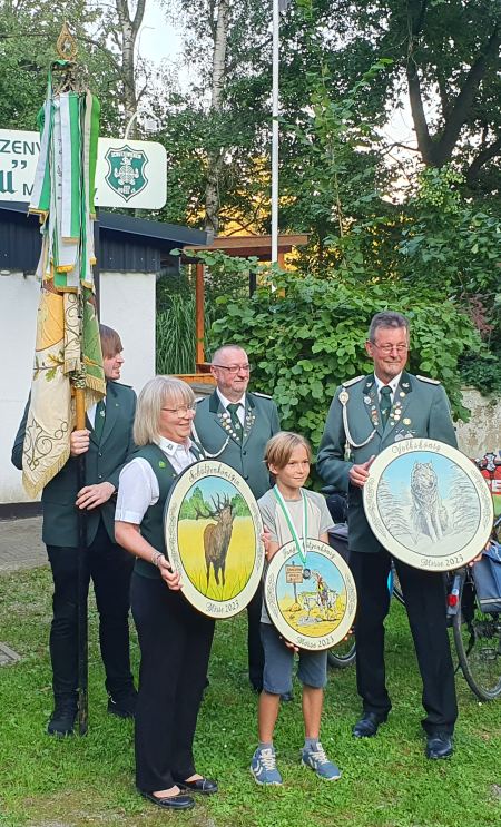 vlnr: Tom Bruchmann(Fahne), Michaela Habener (Schützenkönigin) , Klaus Hettwer (Schießsportleiter), Simon Nerlich (mit der Scheibe des Jugendkönigs) und Ullrich Müller (1. Vorsitzender mit der Scheibe des Volkskönigs).