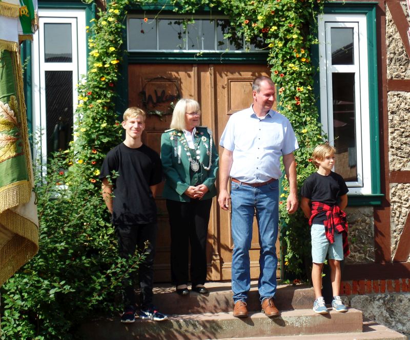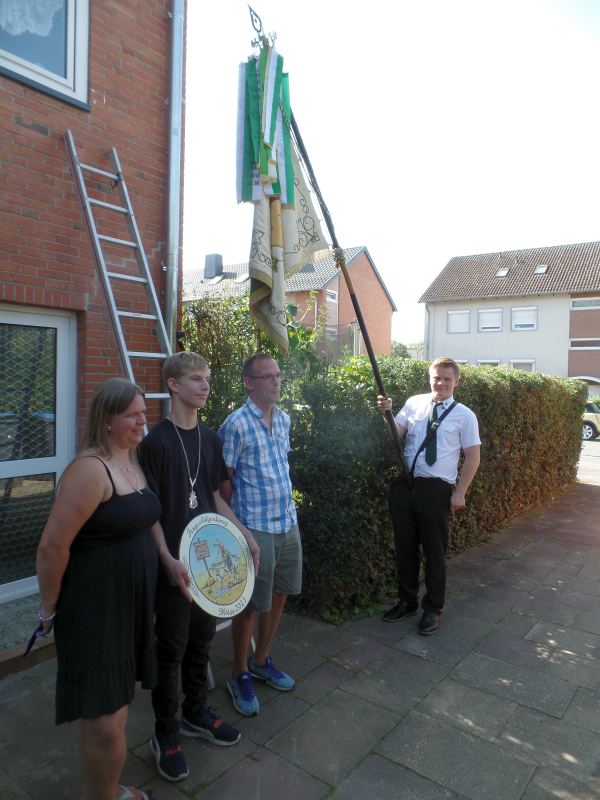 "Jugendkönig Mika mit den Königs-Eltern und Fahnenträger Silas Peeck."