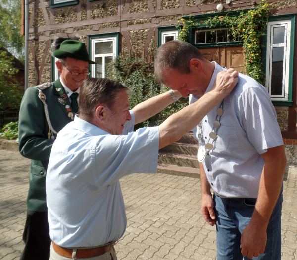 "Der alte Volkskönig Reinhold übergibt dem neuen Volkskönig Stephan die Kette."